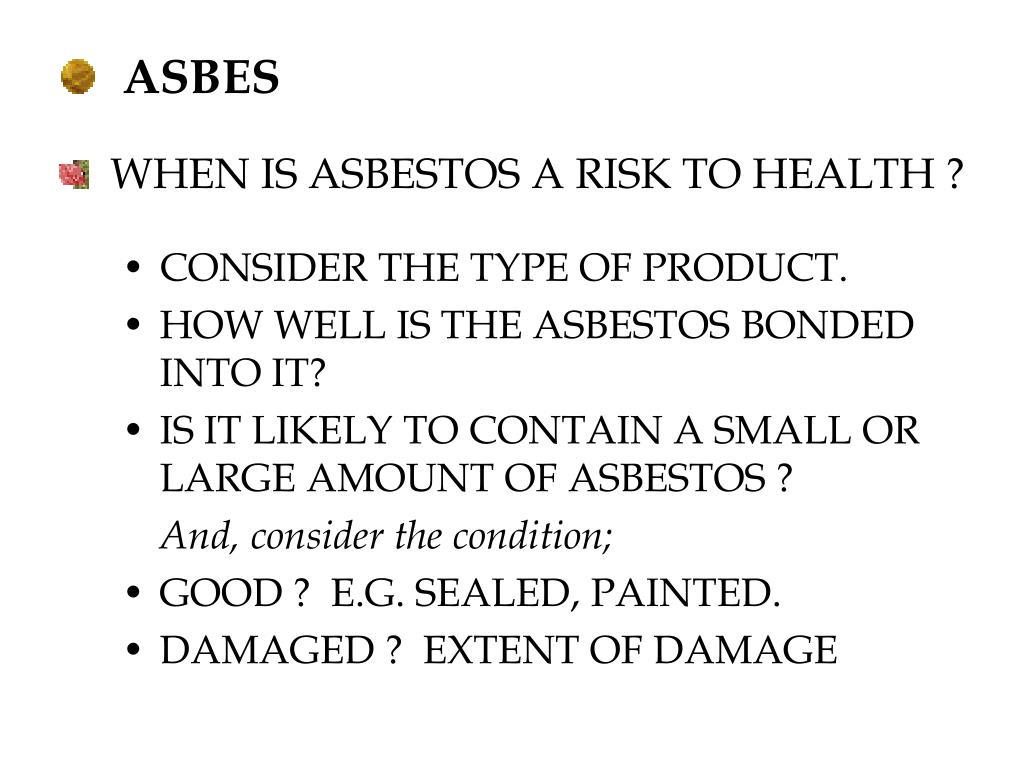 ASBES • WHEN IS ASBESTOS A RISK TO HEALTH ? • CONSIDER THE TYPE OF PRODUCT. • HOW WELL IS THE ASBESTOS BONDED INTO IT? • IS IT LIKELY TO CONTAIN A SMALL OR LARGE AMOUNT OF ASBESTOS ? And, consider the condition; • GOOD ? E.G. SEALED, PAINTED. • DAMAGED ? EXTENT OF DAMAGE