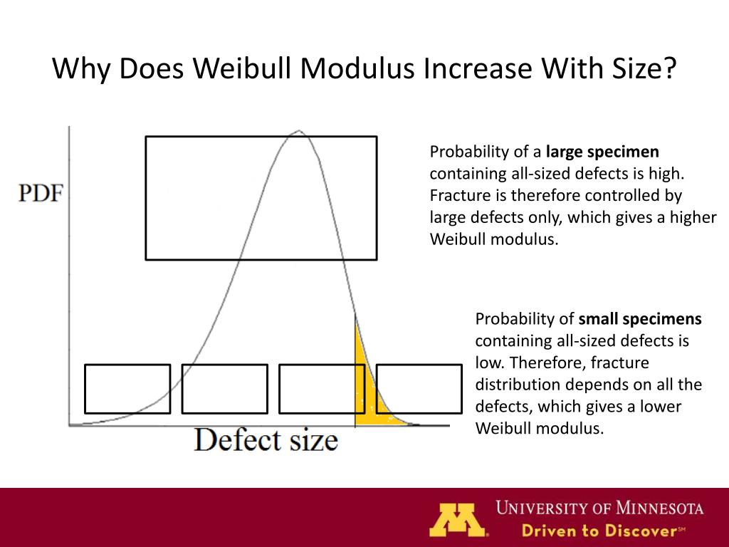 Why Does Weibull Modulus Increase With Size? Probability of a large specimen containing all-sized defects is high. Fracture is therefore controlled by large defects only, which gives a higher Weibull modulus. Probability of small specimens containing all-sized defects is low. Therefore, fracture distribution depends on all the defects, which gives a lower Weibull modulus.