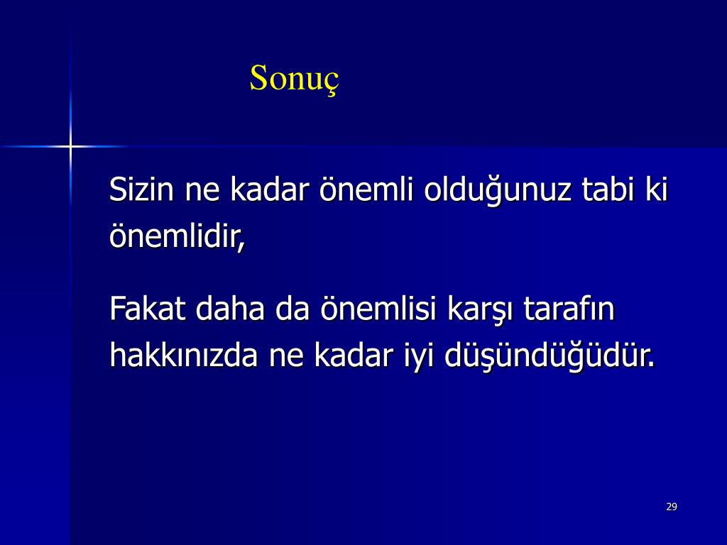 Sonuç Sizin ne kadar önemli olduğunuz tabi ki önemlidir, Fakat daha da önemlisi karşı tarafın hakkınızda ne kadar iyi düşündüğüdür.