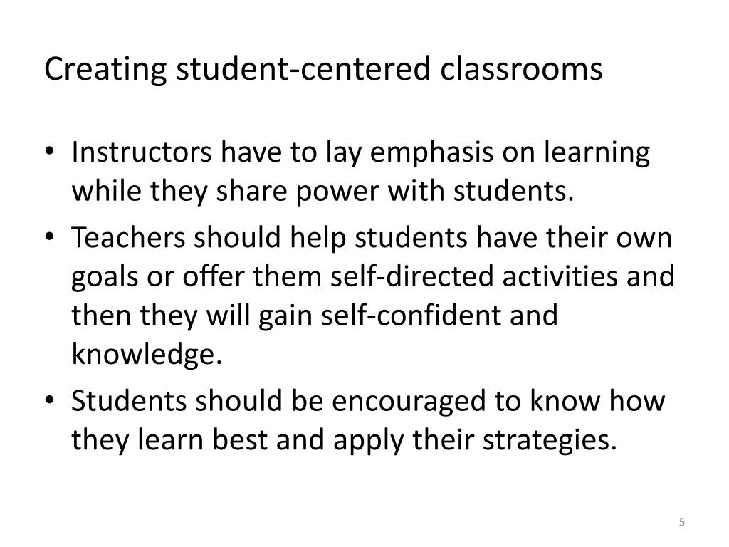 Creating student-centered classrooms • Instructors have to lay emphasis on learning while they share power with students. • Teachers should help students have their own goals or offer them self-directed activities and then they will gain self-confident and knowledge. • Students should be encouraged to know how they learn best and apply their strategies.