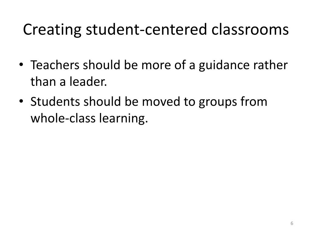 Creating student-centered classrooms • Teachers should be more of a guidance rather than a leader. • Students should be moved to groups from whole-class learning.