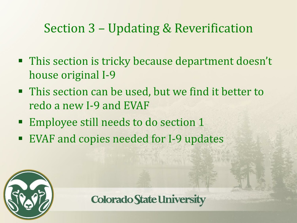 Section 3 – Updating & Reverification • This section is tricky because department doesn’t house original I-9 • This section can be used, but we find it better to redo a new I-9 and EVAF • Employee still needs to do section 1 • EVAF and copies needed for I-9 updates