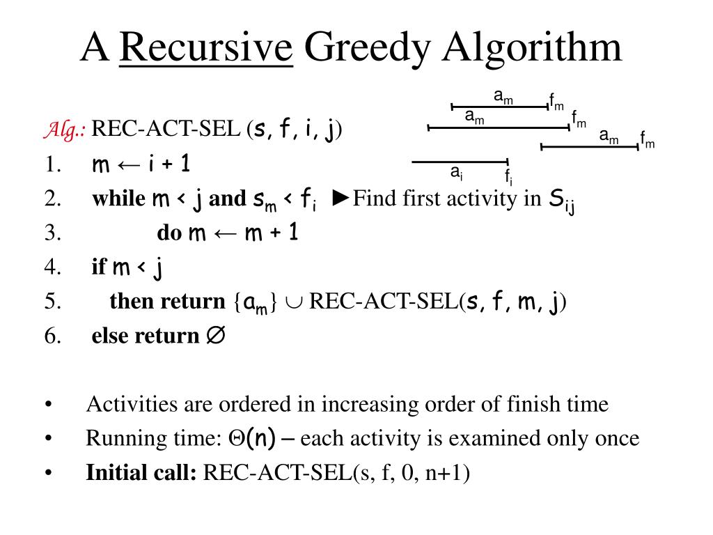 Theorem Let Sij and am be the activity in Sij with the earliest finish time: fm = min { fk: ak Sij } Then: • am is used in some maximum-size subset of mutually compatible activities of Sij • There exists some optimal solution that contains am • Sim = • Choosing am leaves Smj the only non-empty subproblem