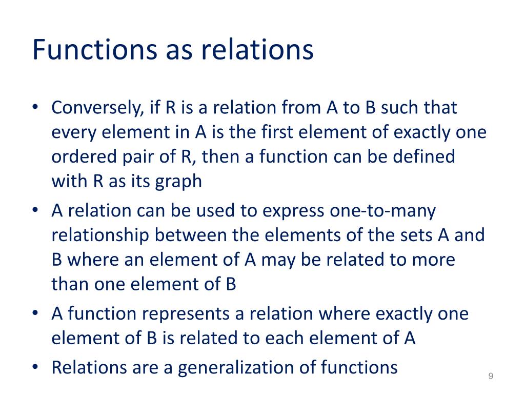 Functions as relations • Conversely, if R is a relation from A to B such that every element in A is the first element of exactly one ordered pair of R, then a function can be defined with R as its graph • A relation can be used to express one-to-many relationship between the elements of the sets A and B where an element of A may be related to more than one element of B • A function represents a relation where exactly one element of B is related to each element of A • Relations are a generalization of functions