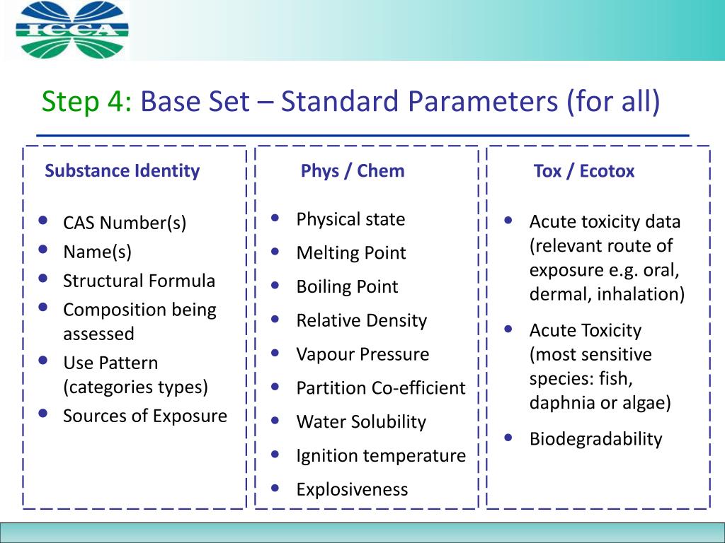 Step 4: Base Set – Standard Parameters (for all) • Substance Identity • CAS Number(s) • Name(s) • Structural Formula • Composition being assessed • Use Pattern (categories types) • Sources of Exposure Phys / Chem • Physical state • Melting Point • Boiling Point • Relative Density • Vapour Pressure • Partition Co-efficient • Water Solubility • Ignition temperature • Explosiveness Tox / Ecotox • Acute toxicity data (relevant route of exposure e.g. oral, dermal, inhalation) • Acute Toxicity (most sensitive species: fish, daphnia or algae) • Biodegradability