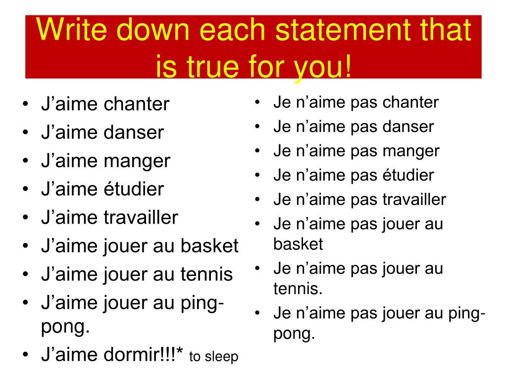 Write down each statement that is true for you! • J’aime chanter • J’aime danser • J’aime manger • J’aime étudier • J’aime travailler • J’aime jouer au basket • J’aime jouer au tennis • J’aime jouer au ping-pong. • J’aime dormir!!!* to sleep • Je n’aime pas chanter • Je n’aime pas danser • Je n’aime pas manger • Je n’aime pas étudier • Je n’aime pas travailler • Je n’aime pas jouer au basket • Je n’aime pas jouer au tennis. • Je n’aime pas jouer au ping-pong.