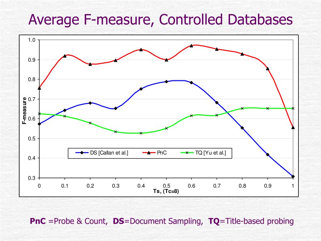 Average F-measure, Controlled Databases PnC =Probe & Count, DS=Document Sampling, TQ=Title-based probing