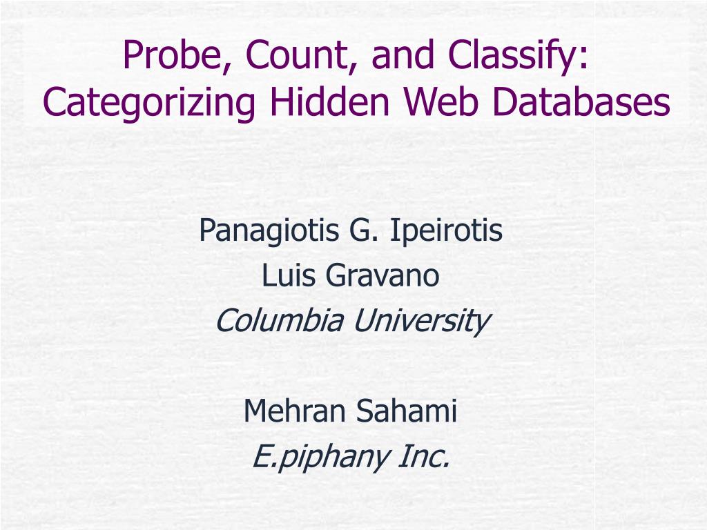 Probe, Count, and Classify:Categorizing Hidden Web Databases Panagiotis G. Ipeirotis Luis Gravano Columbia University Mehran Sahami E.piphany Inc.