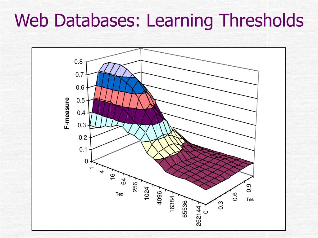 Experimental Results:Web Databases • 130 RealWeb Databases. • F-measure above 0.7 for best <Tc, Ts> combination learned. • 185 query probes per database on average needed for classification. • Also, probes are short: 1.5 words on average; 4 words maximum.