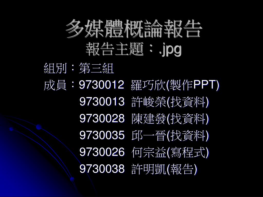 多媒體概論報告報告主題:.jpg 組別:第三組 成員:9730012 羅巧欣(製作PPT) 9730013 許峻榮(找資料) 9730028 陳建發(找資料) 9730035 邱一晉(找資料) 9730026 何宗益(寫程式) 9730038 許明凱(報告)