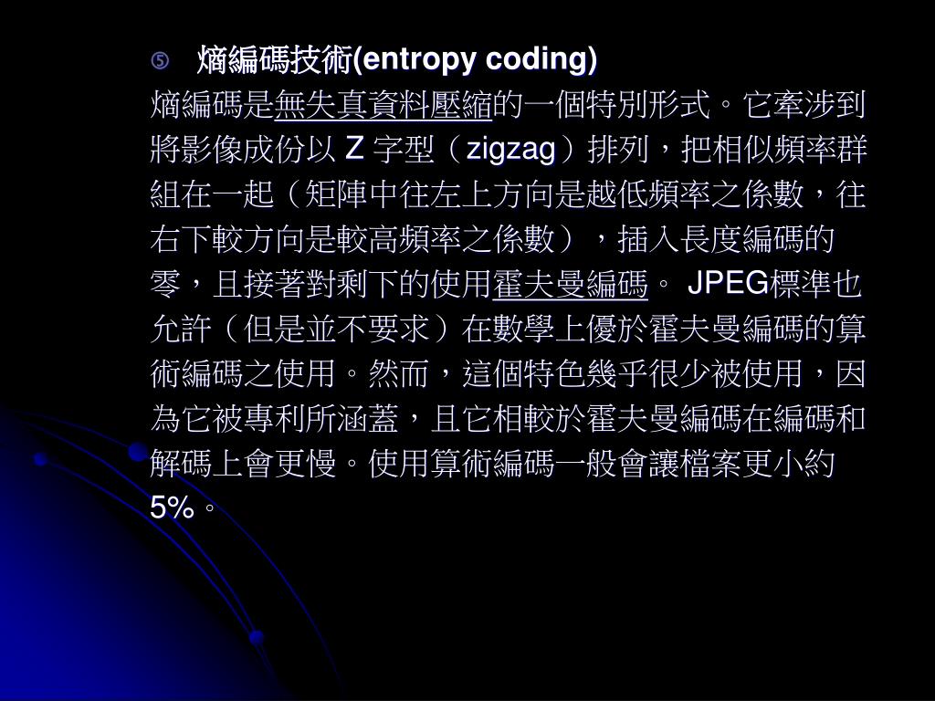 熵編碼技術(entropy coding) 熵編碼是無失真資料壓縮的一個特別形式。它牽涉到 將影像成份以 Z 字型(zigzag)排列,把相似頻率群 組在一起(矩陣中往左上方向是越低頻率之係數,往 右下較方向是較高頻率之係數),插入長度編碼的 零,且接著對剩下的使用霍夫曼編碼。 JPEG標準也 允許(但是並不要求)在數學上優於霍夫曼編碼的算 術編碼之使用。然而,這個特色幾乎很少被使用,因 為它被專利所涵蓋,且它相較於霍夫曼編碼在編碼和 解碼上會更慢。使用算術編碼一般會讓檔案更小約 5%。