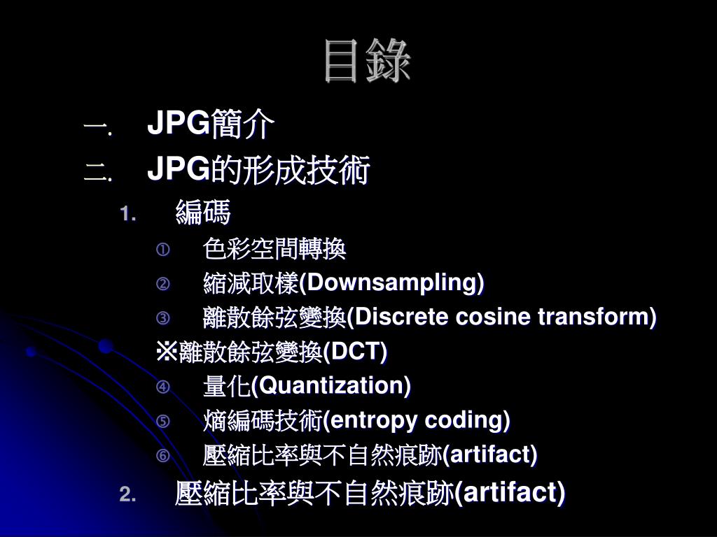 目錄 JPG簡介 JPG的形成技術 編碼 色彩空間轉換 縮減取樣(Downsampling) 離散餘弦變換(Discrete cosine transform) ※離散餘弦變換(DCT) 量化(Quantization) 熵編碼技術(entropy coding) 壓縮比率與不自然痕跡(artifact) 壓縮比率與不自然痕跡(artifact)