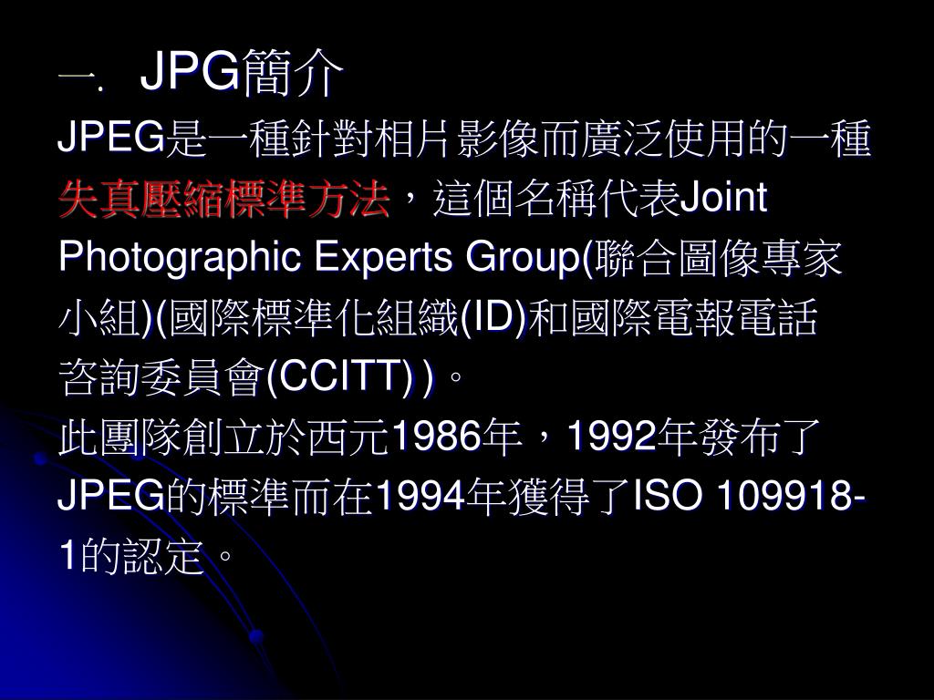 JPG簡介 JPEG是一種針對相片影像而廣泛使用的一種 失真壓縮標準方法,這個名稱代表Joint Photographic Experts Group(聯合圖像專家 小組)(國際標準化組織(ID)和國際電報電話 咨詢委員會(CCITT))。 此團隊創立於西元1986年,1992年發布了 JPEG的標準而在1994年獲得了ISO 109918- 1的認定。