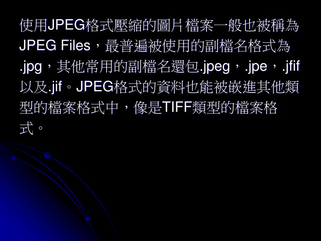 使用JPEG格式壓縮的圖片檔案一般也被稱為 JPEG Files,最普遍被使用的副檔名格式為 .jpg,其他常用的副檔名還包.jpeg,.jpe,.jfif 以及.jif。JPEG格式的資料也能被嵌進其他類 型的檔案格式中,像是TIFF類型的檔案格 式。