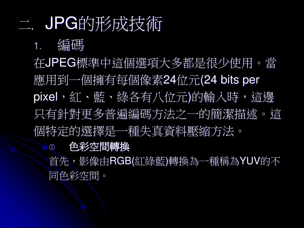 JPG的形成技術 • 編碼 在JPEG標準中這個選項大多都是很少使用。當 應用到一個擁有每個像素24位元(24 bits per pixel,紅、藍、綠各有八位元)的輸入時,這邊 只有針對更多普遍編碼方法之一的簡潔描述。這 個特定的選擇是一種失真資料壓縮方法。 • 色彩空間轉換 首先,影像由RGB(紅綠藍)轉換為一種稱為YUV的不 同色彩空間。
