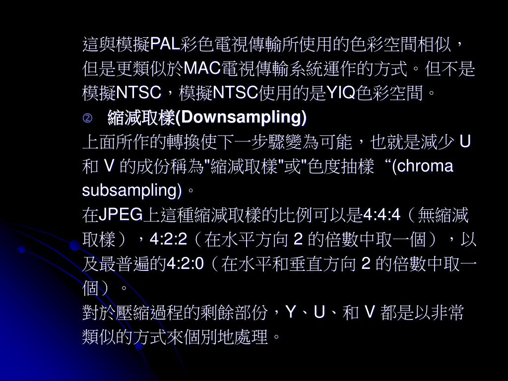 這與模擬PAL彩色電視傳輸所使用的色彩空間相似,這與模擬PAL彩色電視傳輸所使用的色彩空間相似, 但是更類似於MAC電視傳輸系統運作的方式。但不是 模擬NTSC,模擬NTSC使用的是YIQ色彩空間。 • 縮減取樣(Downsampling) 上面所作的轉換使下一步驟變為可能,也就是減少 U 和 V 的成份稱為"縮減取樣"或"色度抽樣“(chroma subsampling)。 在JPEG上這種縮減取樣的比例可以是4:4:4(無縮減 取樣),4:2:2(在水平方向 2 的倍數中取一個),以 及最普遍的4:2:0(在水平和垂直方向 2 的倍數中取一 個)。 對於壓縮過程的剩餘部份,Y、U、和 V 都是以非常 類似的方式來個別地處理。