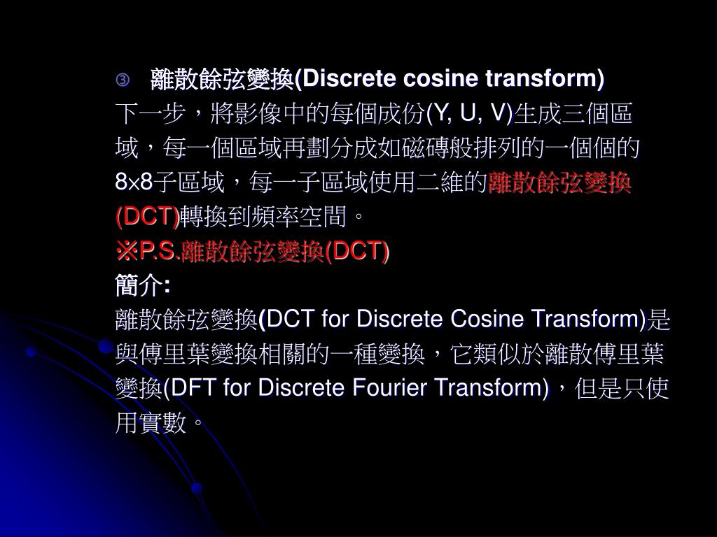 離散餘弦變換(Discrete cosine transform) 下一步,將影像中的每個成份(Y, U, V)生成三個區 域,每一個區域再劃分成如磁磚般排列的一個個的 8×8子區域,每一子區域使用二維的離散餘弦變換 (DCT)轉換到頻率空間。 ※P.S.離散餘弦變換(DCT) 簡介: 離散餘弦變換(DCT for Discrete Cosine Transform)是 與傅里葉變換相關的一種變換,它類似於離散傅里葉 變換(DFT for Discrete Fourier Transform),但是只使 用實數。