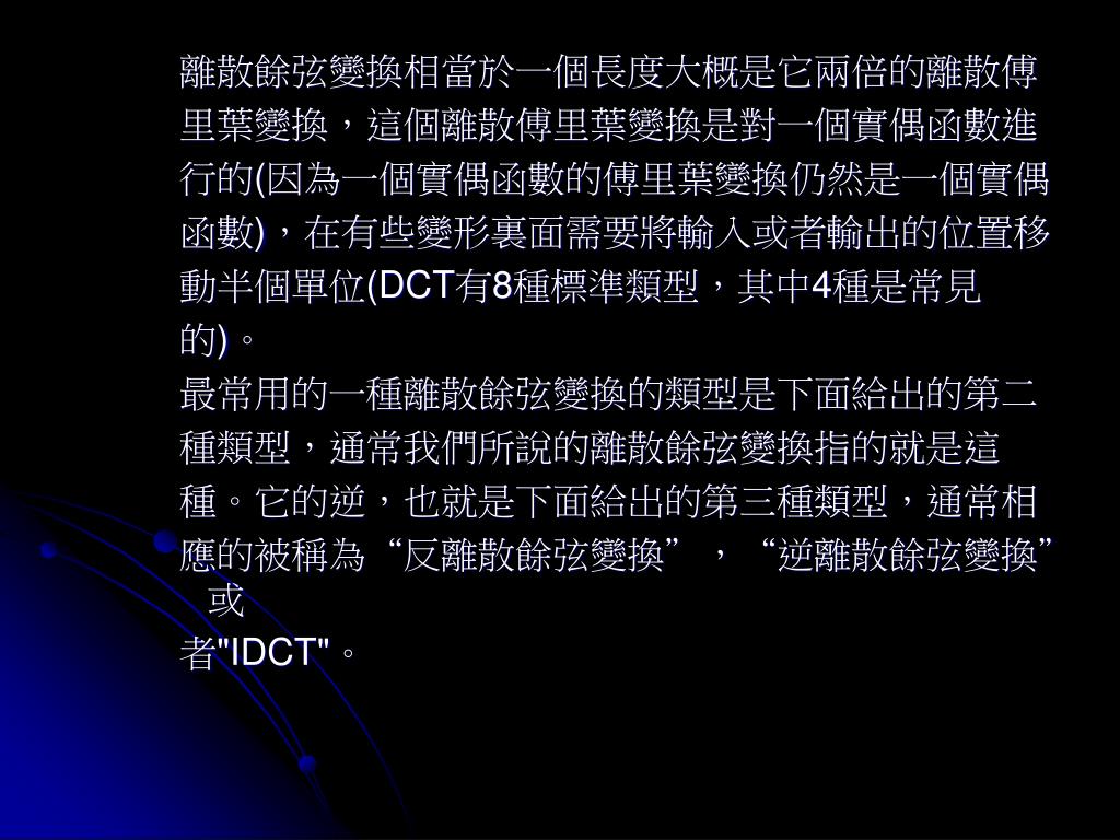 離散餘弦變換相當於一個長度大概是它兩倍的離散傅離散餘弦變換相當於一個長度大概是它兩倍的離散傅 里葉變換,這個離散傅里葉變換是對一個實偶函數進 行的(因為一個實偶函數的傅里葉變換仍然是一個實偶 函數),在有些變形裏面需要將輸入或者輸出的位置移 動半個單位(DCT有8種標準類型,其中4種是常見 的)。 最常用的一種離散餘弦變換的類型是下面給出的第二 種類型,通常我們所說的離散餘弦變換指的就是這 種。它的逆,也就是下面給出的第三種類型,通常相 應的被稱為“反離散餘弦變換”,“逆離散餘弦變換”或 者"IDCT"。