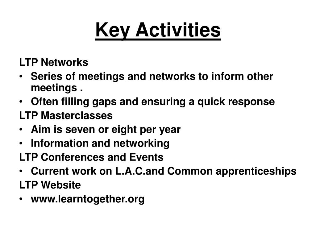Key Activities LTP Networks • Series of meetings and networks to inform other meetings . • Often filling gaps and ensuring a quick response LTP Masterclasses • Aim is seven or eight per year • Information and networking LTP Conferences and Events • Current work on L.A.C.and Common apprenticeships LTP Website • www.learntogether.org