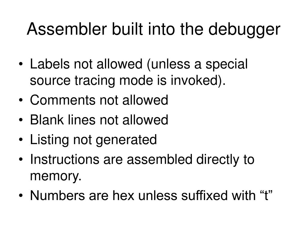 Assembler built into the debugger • Labels not allowed (unless a special source tracing mode is invoked). • Comments not allowed • Blank lines not allowed • Listing not generated • Instructions are assembled directly to memory. • Numbers are hex unless suffixed with “t”
