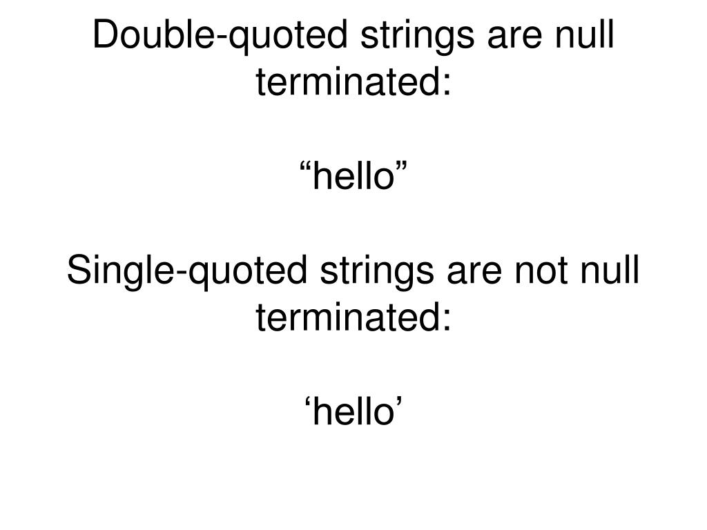 Double-quoted strings are null terminated:“hello”Single-quoted strings are not null terminated:‘hello’