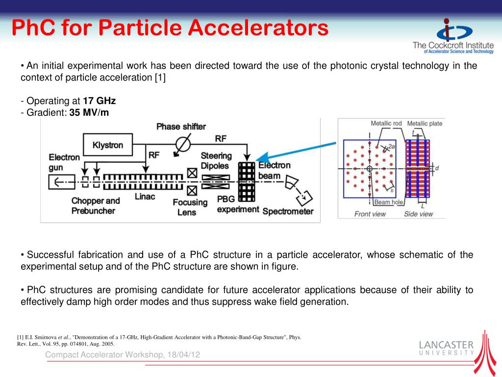 PhC for Particle Accelerators • An initial experimental work has been directed toward the use of the photonic crystal technology in the context of particle acceleration [1] • - Operating at 17 GHz • - Gradient: 35 MV/m • Successful fabrication and use of a PhC structure in a particle accelerator, whose schematic of the experimental setup and of the PhC structure are shown in figure. • PhC structures are promising candidate for future accelerator applications because of their ability to effectively damp high order modes and thus suppress wake field generation. [1] E.I. Smirnova et al., "Demonstration of a 17-GHz, High-Gradient Accelerator with a Photonic-Band-Gap Structure", Phys. Rev. Lett., Vol. 95, pp. 074801, Aug. 2005.