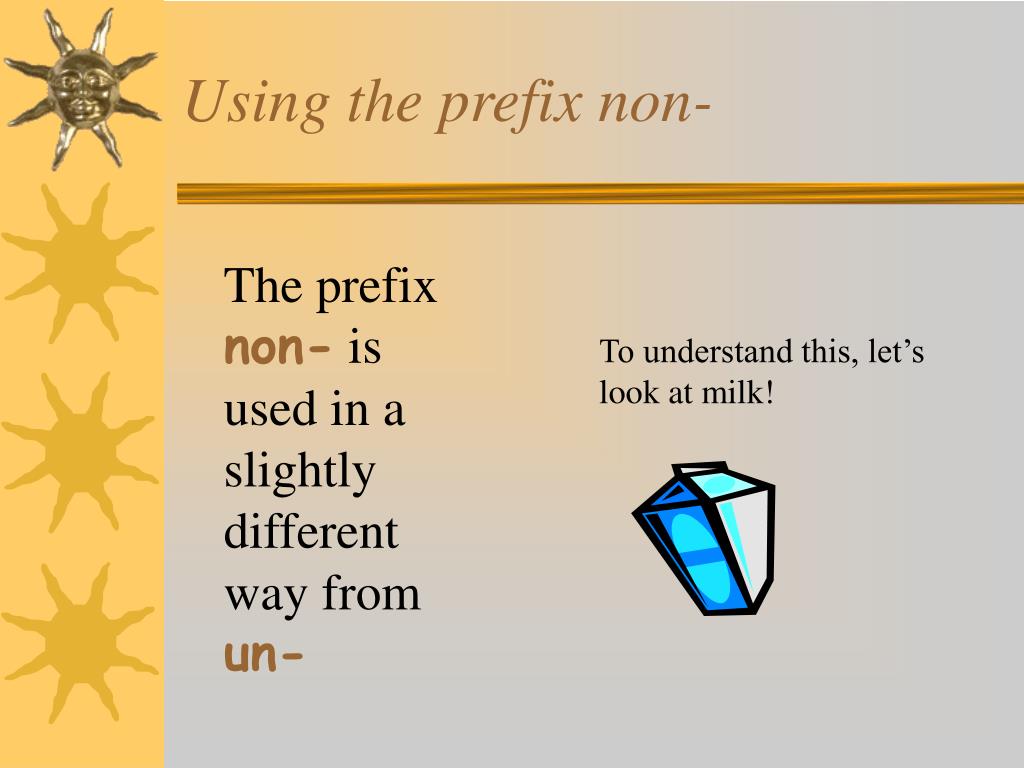 Using the prefix non- The prefix non- is used in a slightly different way from un- To understand this, let’s look at milk!