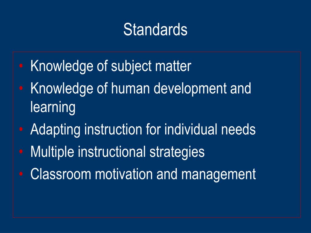 Standards • Knowledge of subject matter • Knowledge of human development and learning • Adapting instruction for individual needs • Multiple instructional strategies • Classroom motivation and management