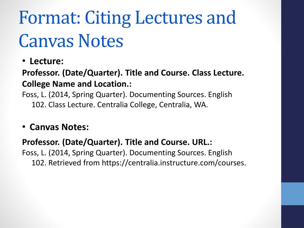 Format: Citing Lectures and Canvas Notes • Lecture: Professor. (Date/Quarter). Title and Course. Class Lecture. College Name and Location.: Foss, L. (2014, Spring Quarter). Documenting Sources. English 102. Class Lecture. Centralia College, Centralia, WA. • Canvas Notes: Professor. (Date/Quarter). Title and Course. URL.: Foss, L. (2014, Spring Quarter). Documenting Sources. English 102. Retrieved from https://centralia.instructure.com/courses.