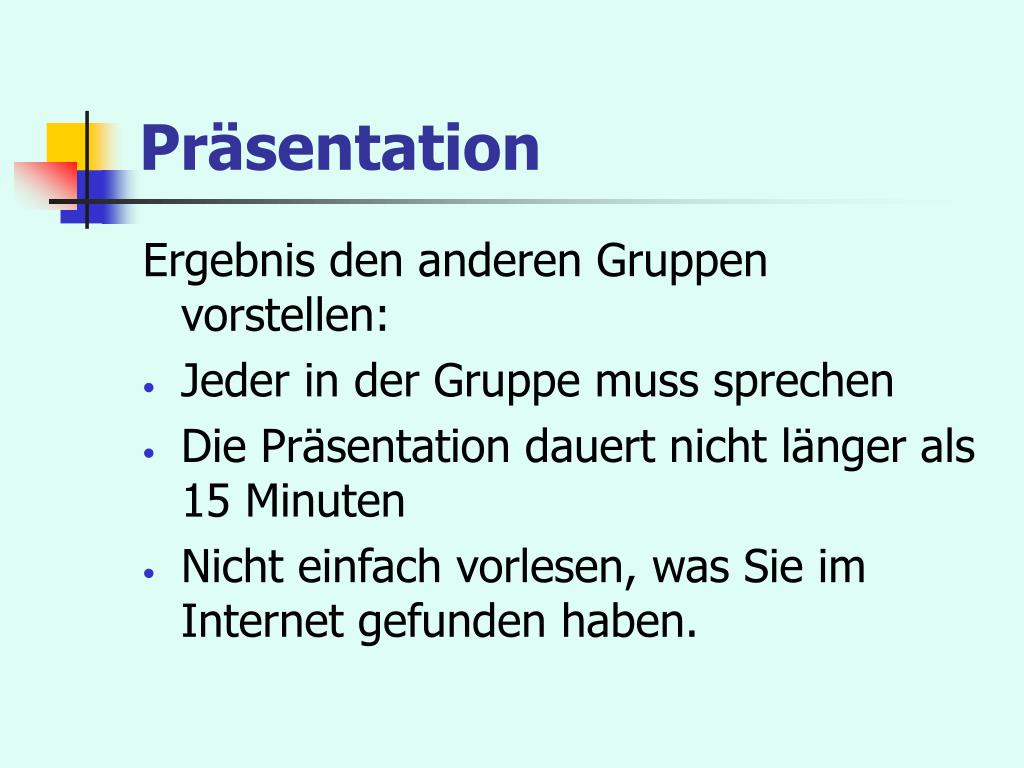 Präsentation Ergebnis den anderen Gruppen vorstellen: • Jeder in der Gruppe muss sprechen • Die Präsentation dauert nicht länger als 15 Minuten • Nicht einfach vorlesen, was Sie im Internet gefunden haben.