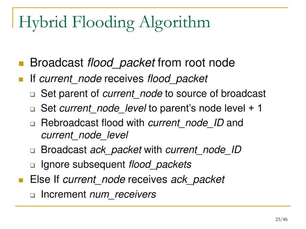 Hybrid Flooding Algorithm • Broadcast flood_packet from root node • If current_node receives flood_packet • Set parent of current_node to source of broadcast • Set current_node_level to parent’s node level + 1 • Rebroadcast flood with current_node_ID and current_node_level • Broadcast ack_packet with current_node_ID • Ignore subsequent flood_packets • Else If current_node receives ack_packet • Increment num_receivers