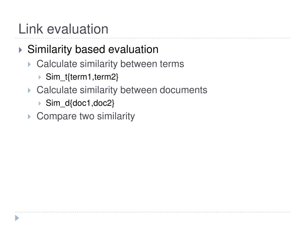 Link evaluation • Similarity based evaluation • Calculate similarity between terms • Sim_t{term1,term2} • Calculate similarity between documents • Sim_d{doc1,doc2} • Compare two similarity