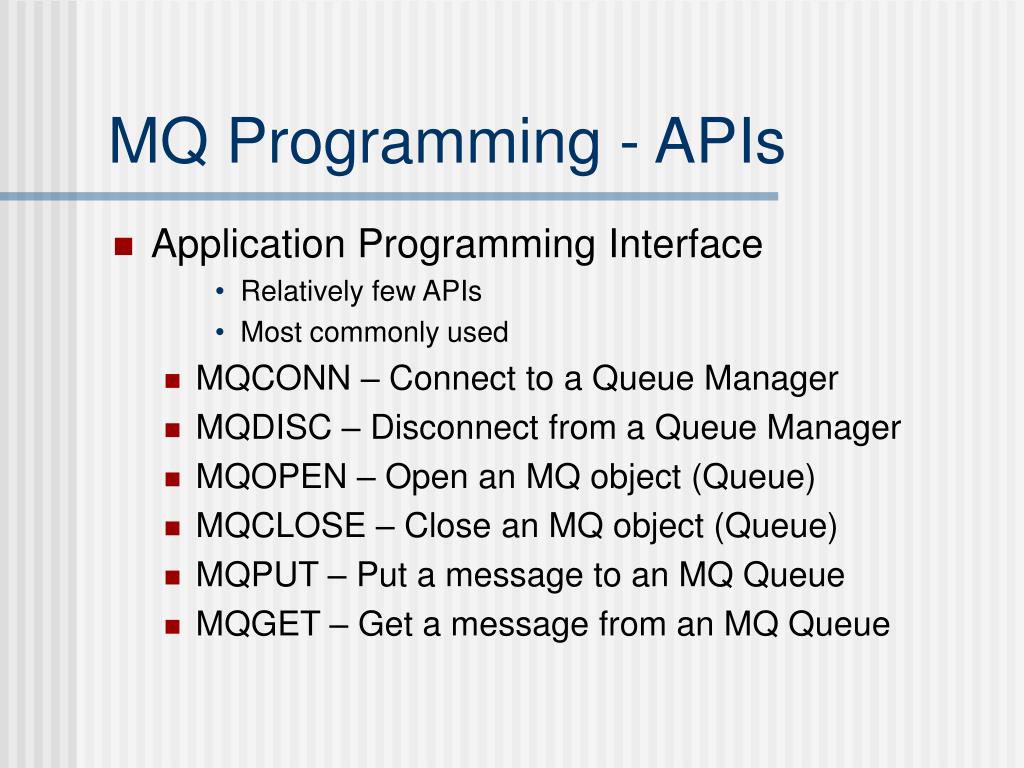 MQ Programming - APIs • Application Programming Interface • Relatively few APIs • Most commonly used • MQCONN – Connect to a Queue Manager • MQDISC – Disconnect from a Queue Manager • MQOPEN – Open an MQ object (Queue) • MQCLOSE – Close an MQ object (Queue) • MQPUT – Put a message to an MQ Queue • MQGET – Get a message from an MQ Queue