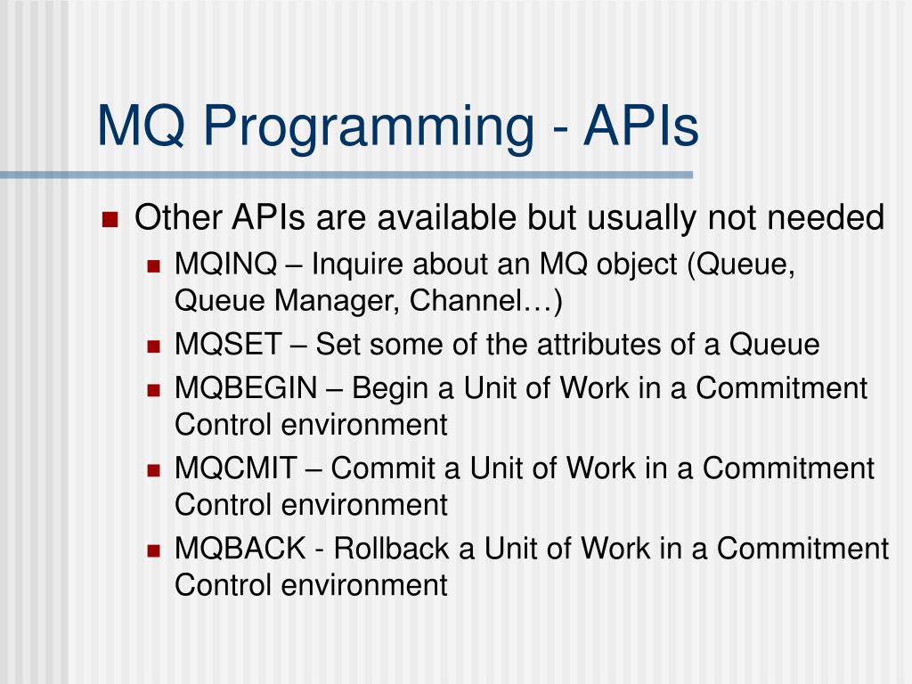 MQ Programming - APIs • Other APIs are available but usually not needed • MQINQ – Inquire about an MQ object (Queue, Queue Manager, Channel…) • MQSET – Set some of the attributes of a Queue • MQBEGIN – Begin a Unit of Work in a Commitment Control environment • MQCMIT – Commit a Unit of Work in a Commitment Control environment • MQBACK - Rollback a Unit of Work in a Commitment Control environment