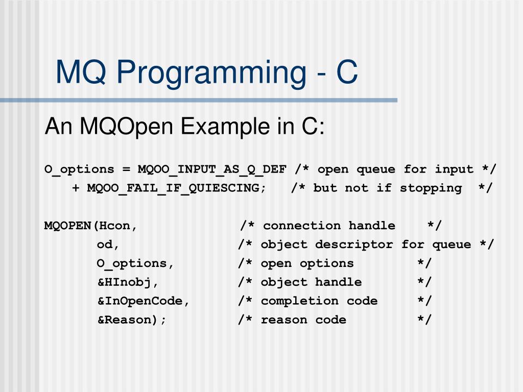 MQ Programming - C An MQOpen Example in C: O_options = MQOO_INPUT_AS_Q_DEF /* open queue for input */ + MQOO_FAIL_IF_QUIESCING; /* but not if stopping */ MQOPEN(Hcon, /* connection handle */ od, /* object descriptor for queue */ O_options, /* open options */ &HInobj, /* object handle */ &InOpenCode, /* completion code */ &Reason); /* reason code */