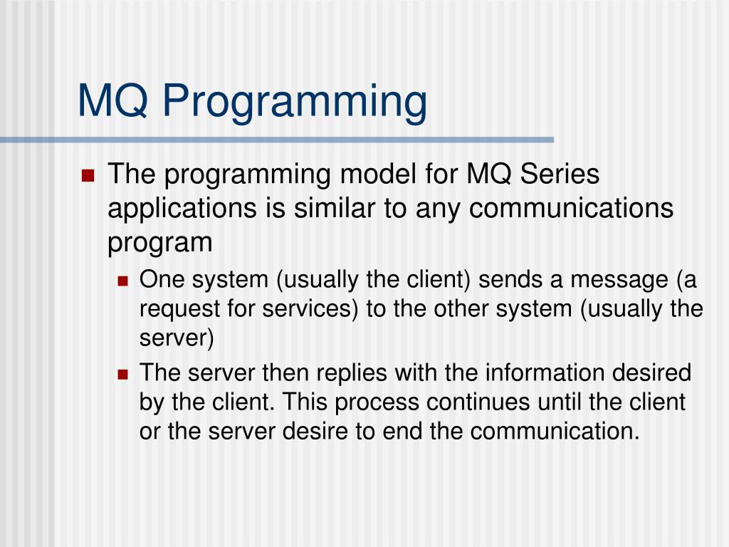 MQ Programming • The programming model for MQ Series applications is similar to any communications program • One system (usually the client) sends a message (a request for services) to the other system (usually the server) • The server then replies with the information desired by the client. This process continues until the client or the server desire to end the communication.