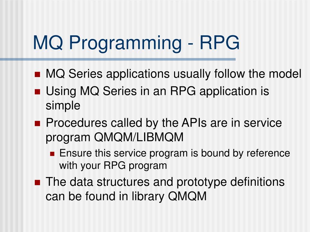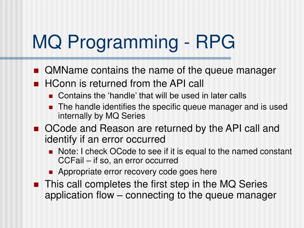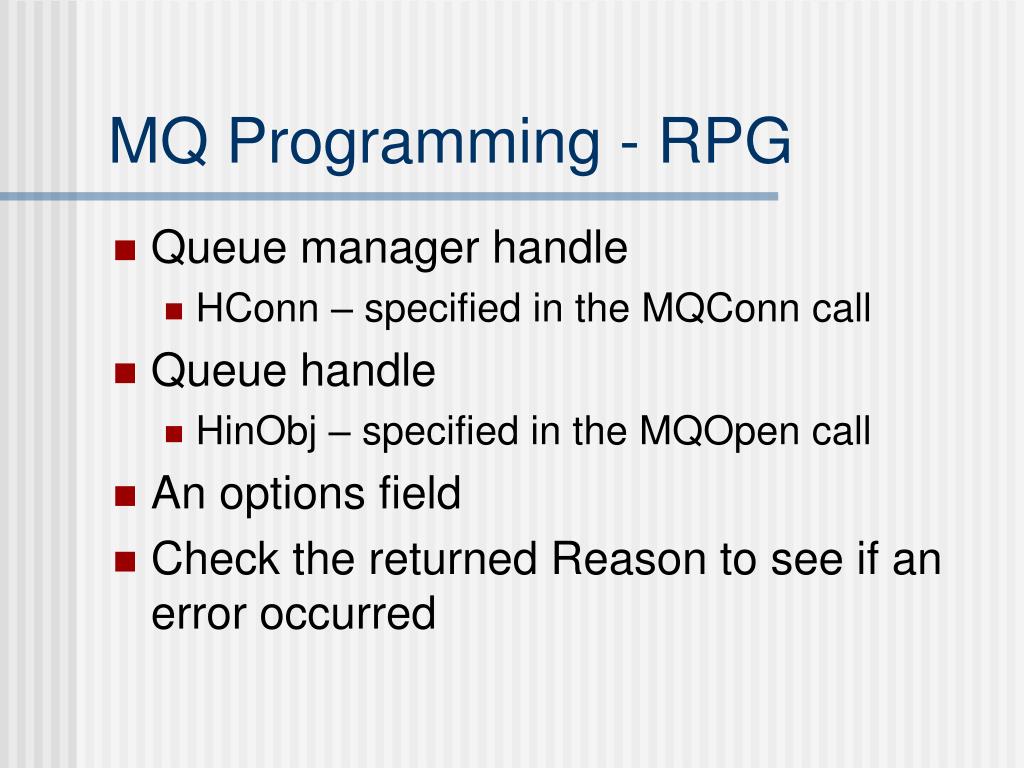 MQ Programming - RPG • Example of connecting to a queue manager: * Connect to MQ Series queue manager. C CallP MQConn(QMName : C HConn : C OCode : C Reason) C If OCode = CCFail * Error occurred... C EndIf