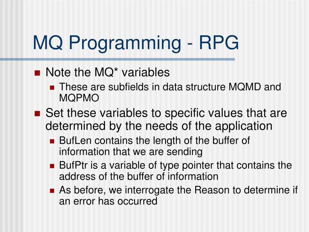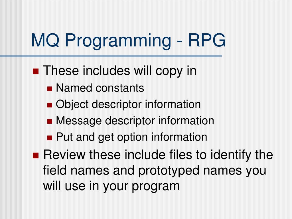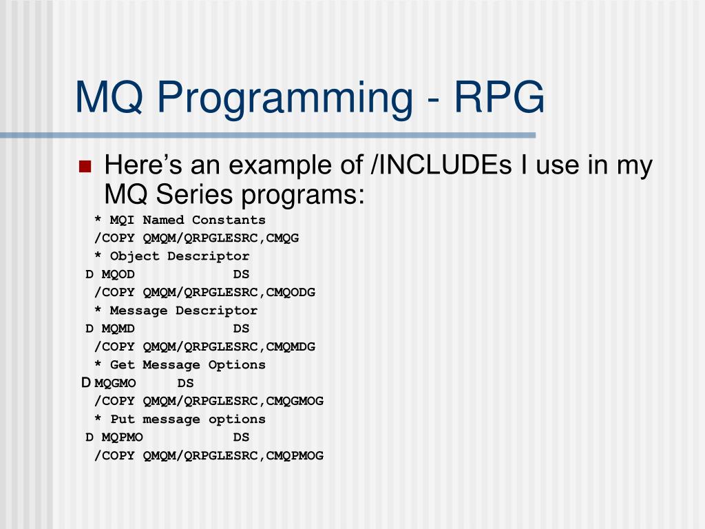 MQ Programming - RPG • Here’s an example of /INCLUDEs I use in my MQ Series programs: * MQI Named Constants /COPY QMQM/QRPGLESRC,CMQG * Object Descriptor D MQOD DS /COPY QMQM/QRPGLESRC,CMQODG * Message Descriptor D MQMD DS /COPY QMQM/QRPGLESRC,CMQMDG * Get Message Options D MQGMODS /COPY QMQM/QRPGLESRC,CMQGMOG * Put message options D MQPMO DS /COPY QMQM/QRPGLESRC,CMQPMOG
