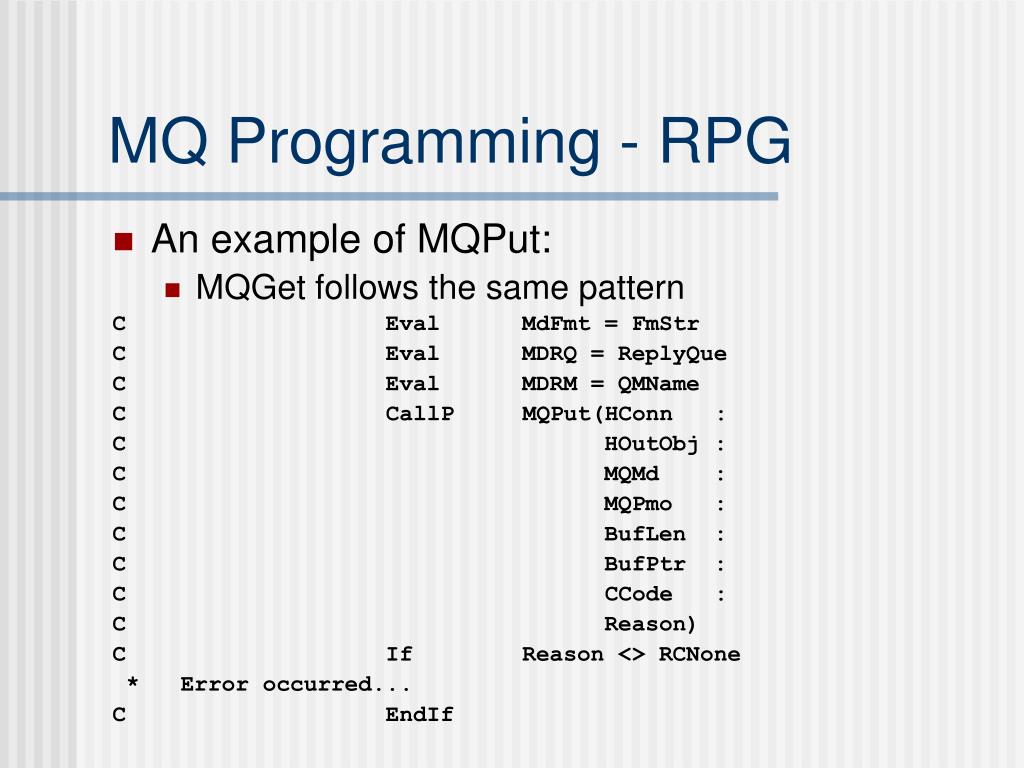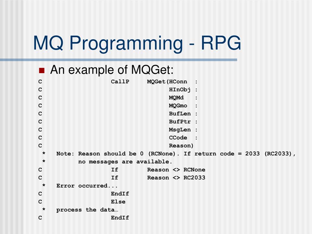 MQ Programming - RPG • Example of opening a queue: * Options are input-as-queue-def and fail-if-quiescing C Eval Opts = OOInpq + OOFIQ C Eval ODon = ReplyQue C CallP MQOpen(HConn : C MQOD : C Opts : C HInObj : C OCode : C Reason) C If Reason <> RCNone * Error occurred... C EndIf