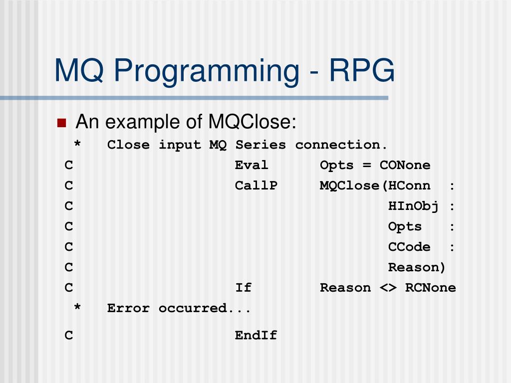 MQ Programming - RPG • An example of MQClose: * Close input MQ Series connection. C Eval Opts = CONone C CallP MQClose(HConn : C HInObj : C Opts : C CCode : C Reason) C If Reason <> RCNone * Error occurred... C EndIf