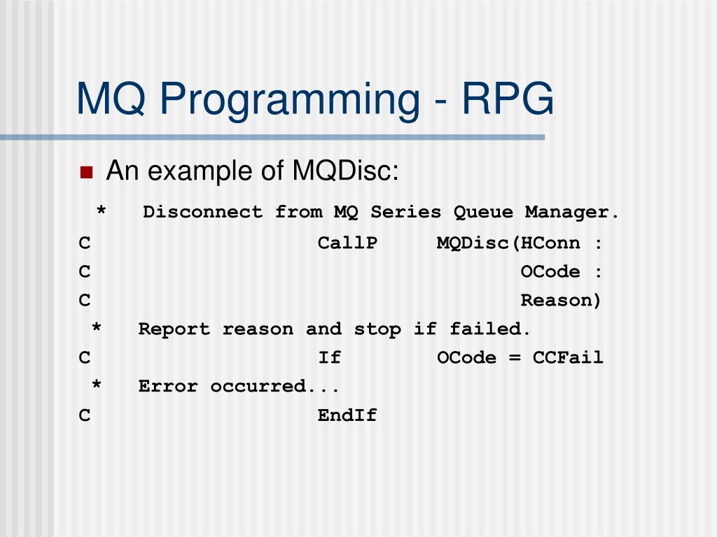 MQ Programming - RPG • An example of MQDisc: * Disconnect from MQ Series Queue Manager. C CallP MQDisc(HConn : C OCode : C Reason) * Report reason and stop if failed. C If OCode = CCFail * Error occurred... C EndIf