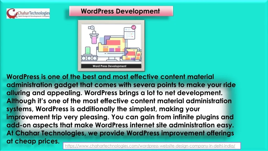 WordPress Development • Word Press Development WordPress is one of the best and most effective content material administration gadget that comes with severa points to make your ride alluring and appealing. WordPress brings a lot to net development. Although it’s one of the most effective content material administration systems, WordPress is additionally the simplest, making your improvement trip very pleasing. You can gain from infinite plugins and add-on aspects that make WordPress internet site administration easy. At Chahar Technologies, we provide WordPress improvement offerings at cheap prices. https://www.chahartechnologies.com/wordpress-website-design-company-in-delhi-india/