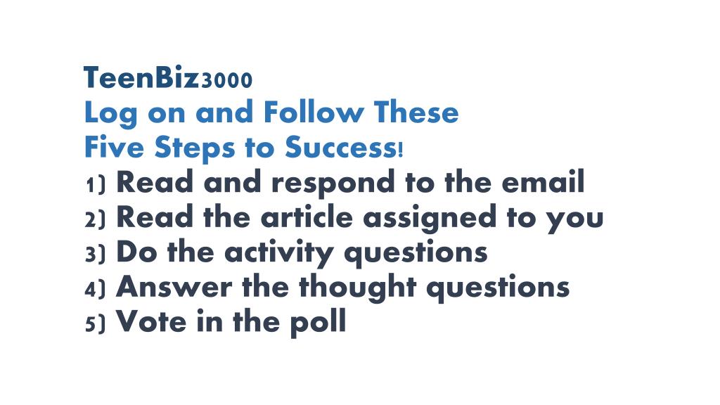 TeenBiz3000 Log on and Follow These Five Steps to Success! 1) Read and respond to the email 2) Read the article assigned to you 3) Do the activity questions 4) Answer the thought questions 5) Vote in the poll.