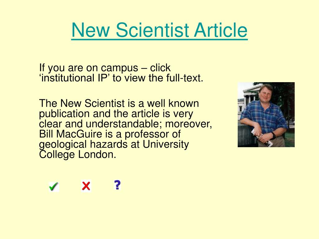 New Scientist Article If you are on campus – click ‘institutional IP’ to view the full-text. The New Scientist is a well known publication and the article is very clear and understandable; moreover, Bill MacGuire is a professor of geological hazards at University College London.
