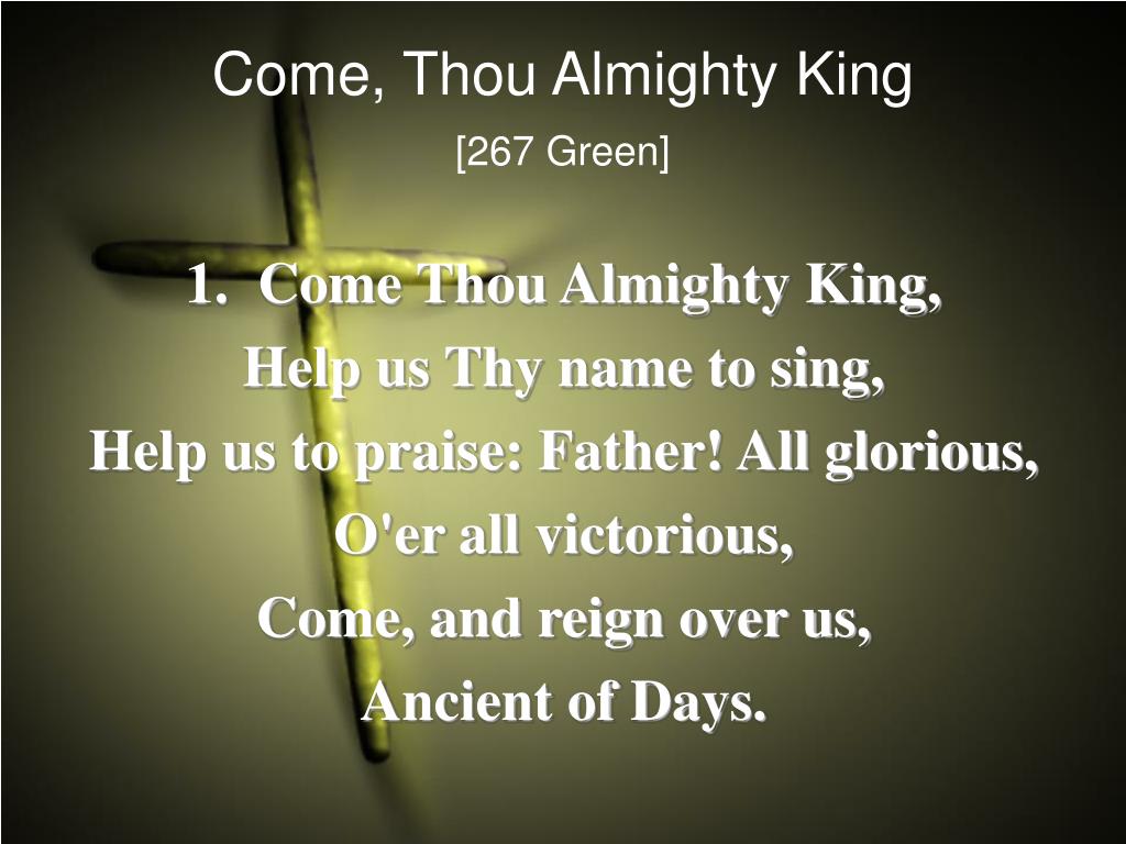 Come, Thou Almighty King [267 Green] 1. Come Thou Almighty King, Help us Thy name to sing, Help us to praise: Father! All glorious, O'er all victorious, Come, and reign over us, Ancient of Days.