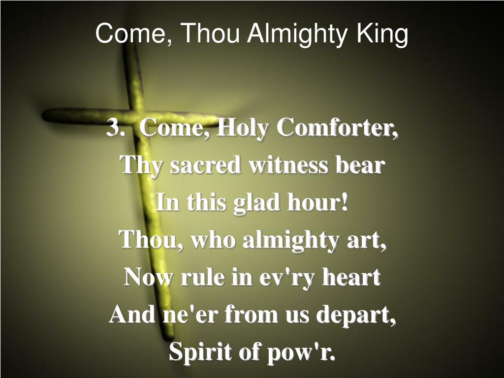 Come, Thou Almighty King 3. Come, Holy Comforter, Thy sacred witness bear In this glad hour! Thou, who almighty art, Now rule in ev'ry heart And ne'er from us depart, Spirit of pow'r.
