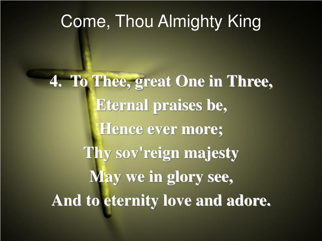 Come, Thou Almighty King 4. To Thee, great One in Three, Eternal praises be, Hence ever more; Thy sov'reign majesty May we in glory see, And to eternity love and adore.