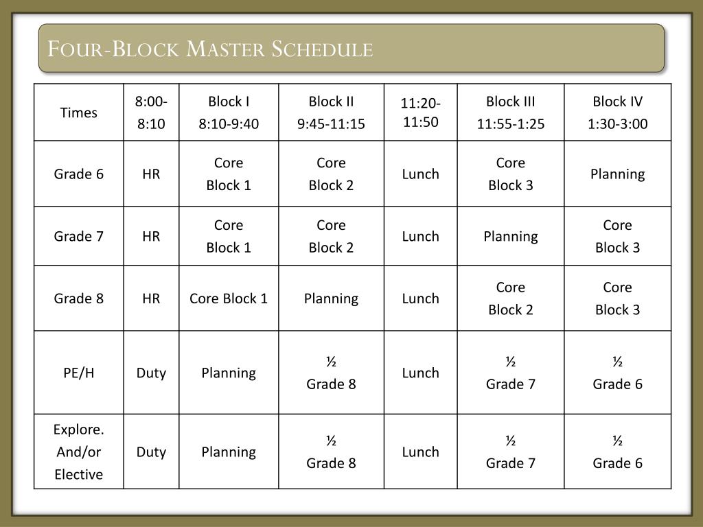 Middle School Scheduling Options • Four-Block Schedule (and variations) • Equal Core Periods > Encore Periods • The Intervention/Enrichment Period • Encore Scheduling Options • Math Scheduling Ideas