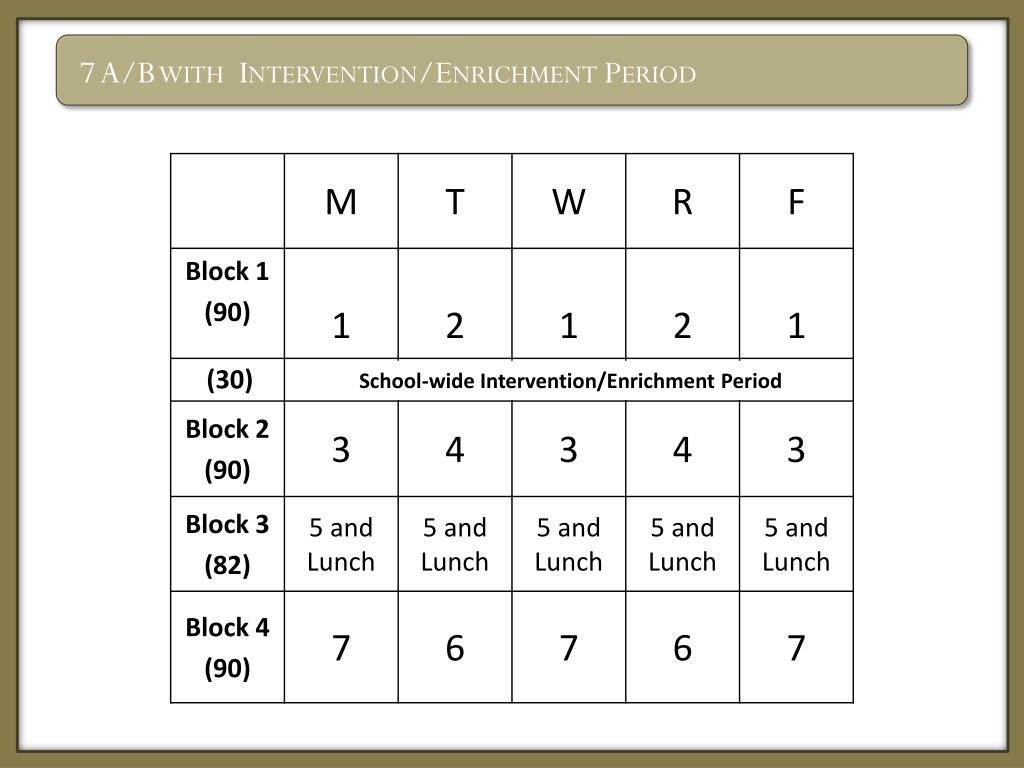 The 8 A/B Schedule with and Intervention/Enrichment Block Day 1 Day 2 2 1 Block I 3 Block II 4 Block III 5 6 Intervention/ Enrichment Block IV 7
