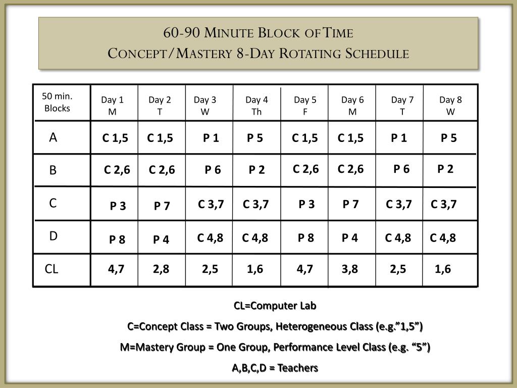 60-90 Minute Block of TimeConcept/Mastery 8-Day Rotating Schedule 50 min. Blocks Day 1 M Day 2 T Day 3 W Day 4 Th Day 5 F Day 6 M Day 7 T Day 8 W A C 1,5 C 1,5 P 1 P 5 C 1,5 C 1,5 P 1 P 5 C 2,6 C 2,6 P 6 P 2 B C 2,6 C 2,6 P 6 P 2 C C 3,7 C 3,7 P 3 P 7 C 3,7 C 3,7 P 3 P 7 D C 4,8 C 4,8 P 8 P 4 C 4,8 C 4,8 P 8 P 4 CL 4,7 2,8 2,5 1,6 4,7 3,8 2,5 1,6 CL=Computer Lab C=Concept Class = Two Groups, Heterogeneous Class (e.g.”1,5”) M=Mastery Group = One Group, Performance Level Class (e.g. “5”) A,B,C,D = Teachers